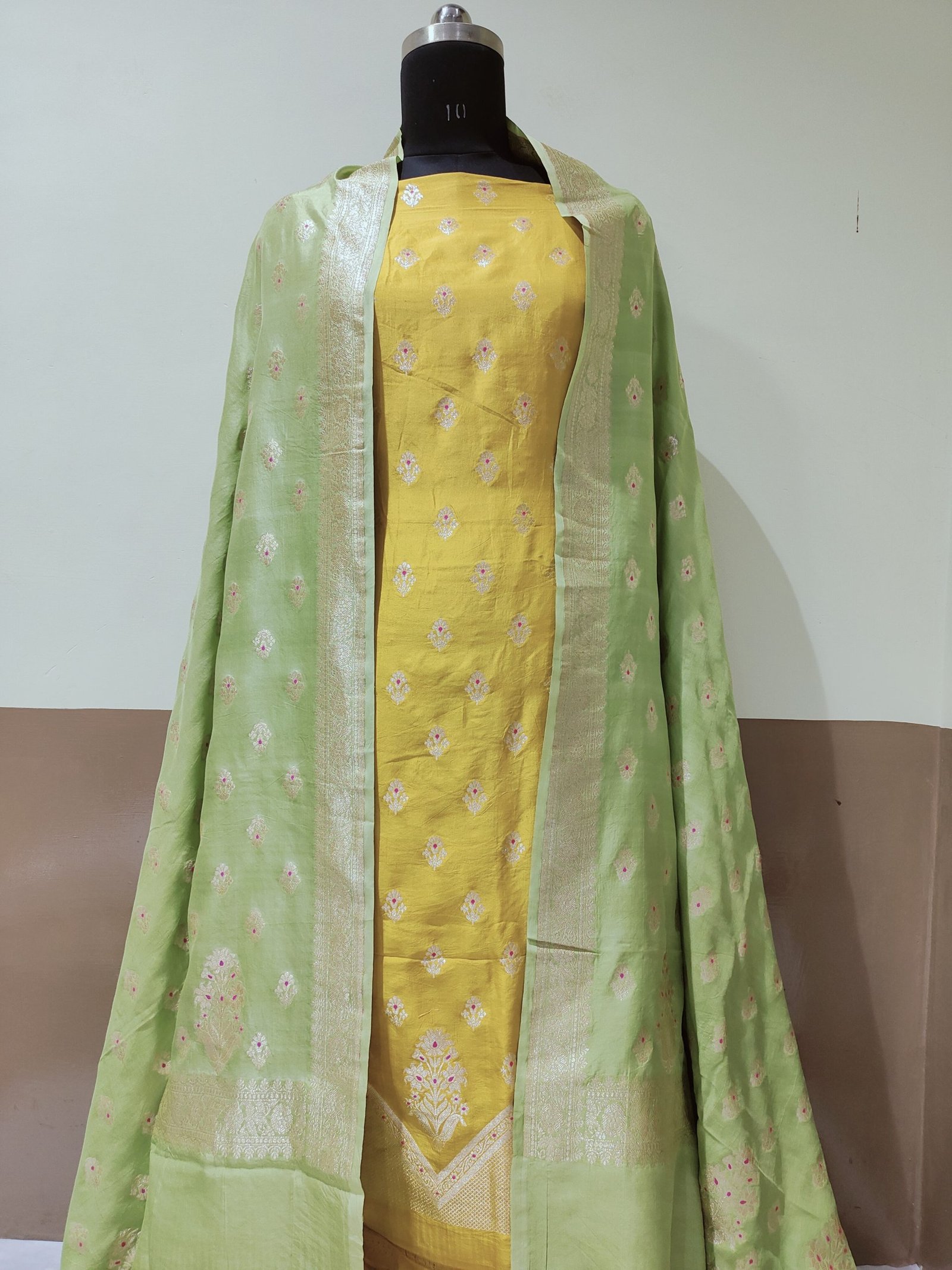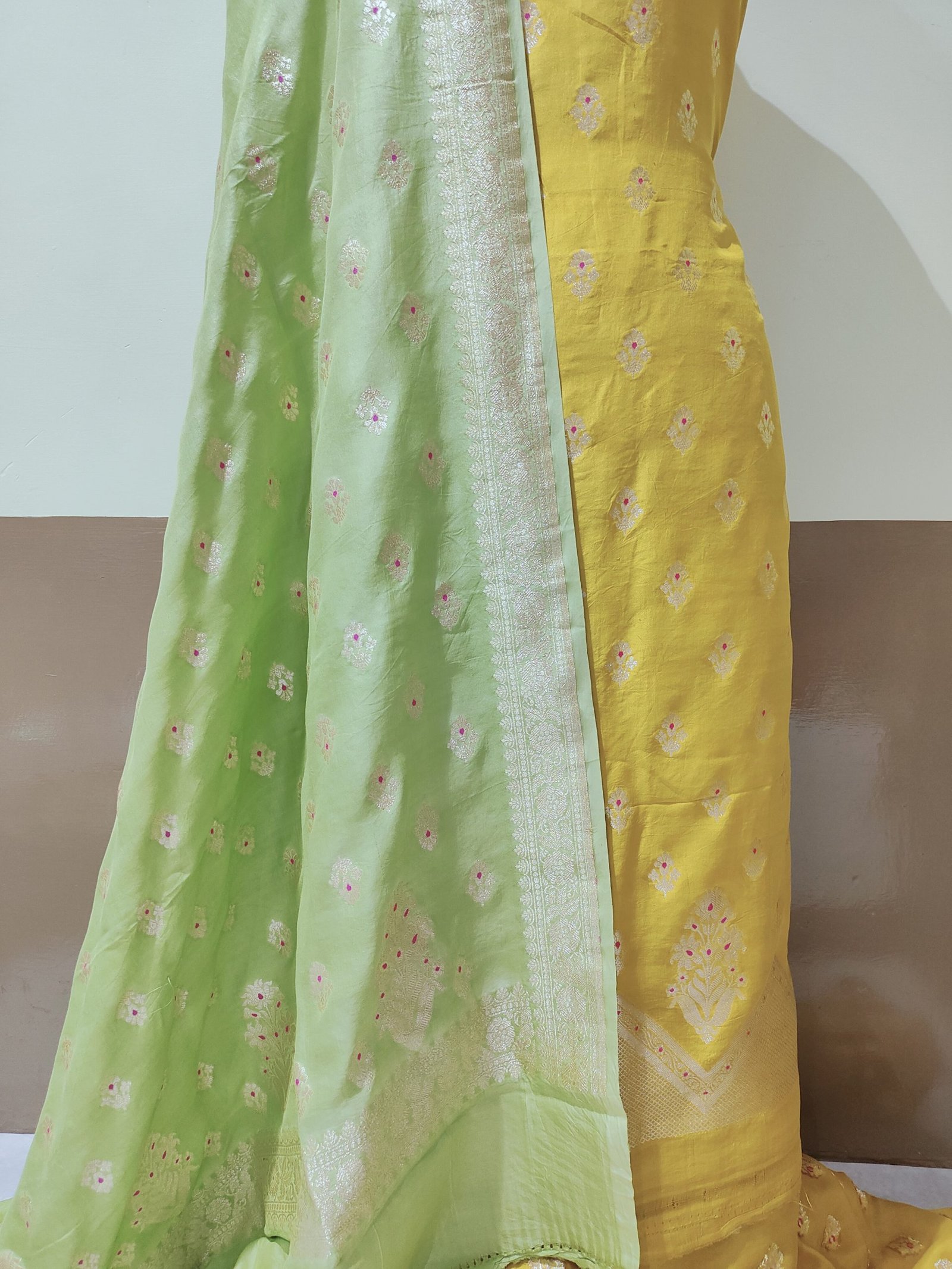 Indulge in timeless elegance with this pure Banarasi silk katan suit-dupatta set, woven to perfection by master artisans on traditional handlooms.