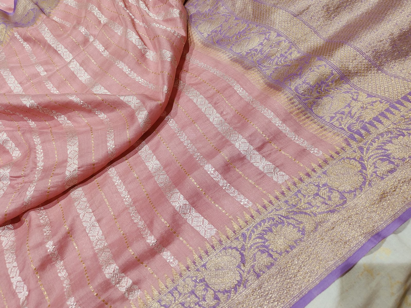 The intricate detailing, fine texture, and lustrous zari make this saree a treasured addition to any wardrobe. Length 5.5 meters with a matching 0.8–1 meter blouse piece, finished to perfection with traditional Banarasi borders and pallu.