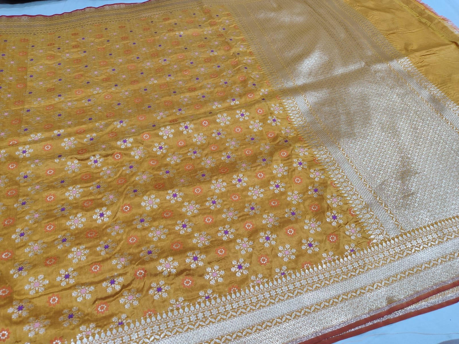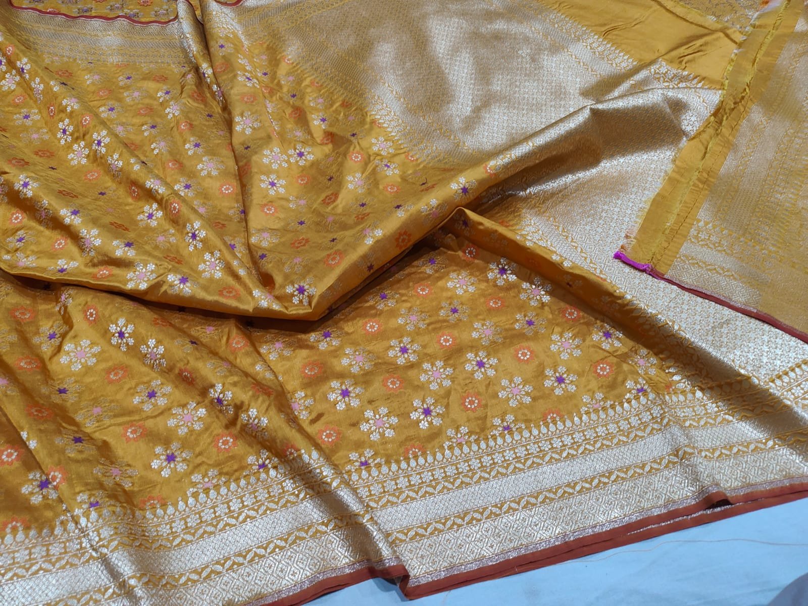 ​The Pallu (End-piece): Visible in the upper right, the pallu features heavy, concentrated Zari weaving, which is characteristic of high-quality Banarasi craftsmanship.