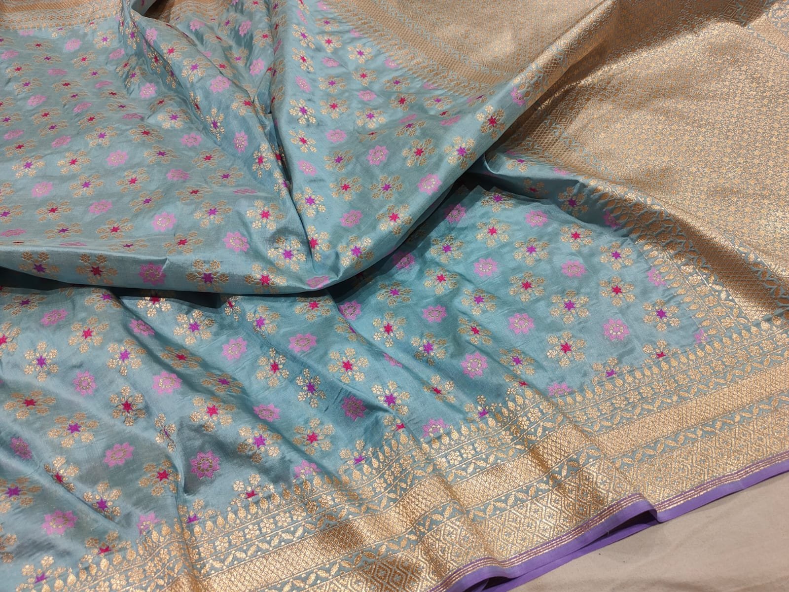 ​Color & Fabric: The base is a soft pastel sea-green (or powder blue) with a subtle sheen, characteristic of high-quality blended silk or art silk. It is framed by a contrasting lavender/light purple piping along the borders.