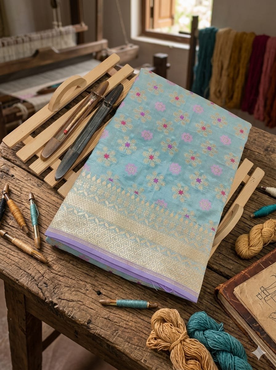 ✨ Work: Handloom Weaving with Gold Zari & Meenakari Buti