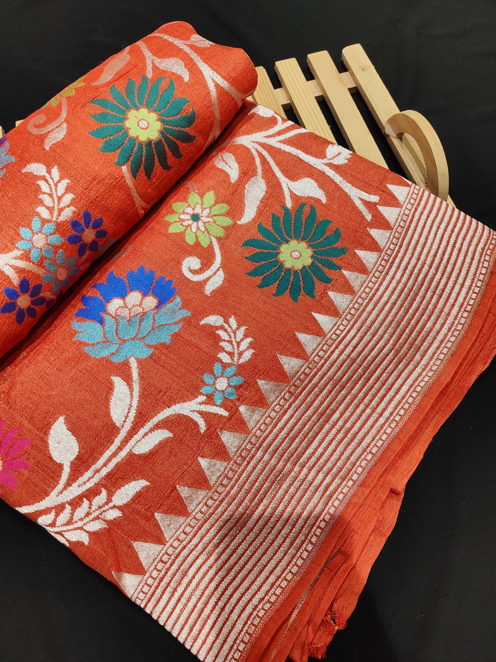 This Pure Banarasi Tussar Khaddi Georgette Saree is a true piece of heritage, crafted by skilled artisans on handloom. Woven in the, it features intricate multi-colour Meenakari motifs that bring vibrant detailing to the soft tussar-georgette fabric. The saree is lightweight yet luxurious, with a graceful drape that makes it perfect for both day and evening occasions. The delicate zari and artistic decoration add a royal touch, making it ideal for weddings, festive wear, and party wear.