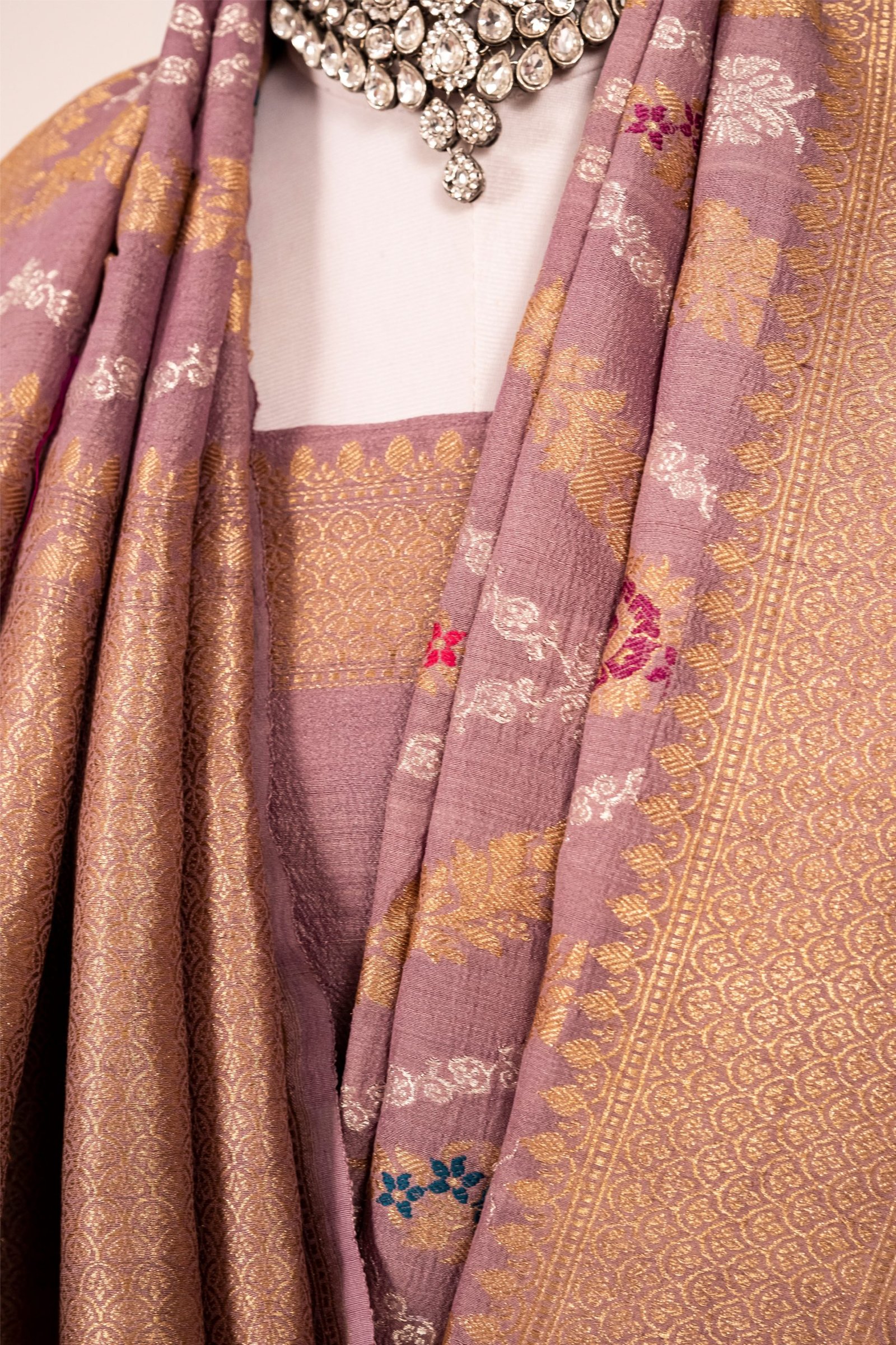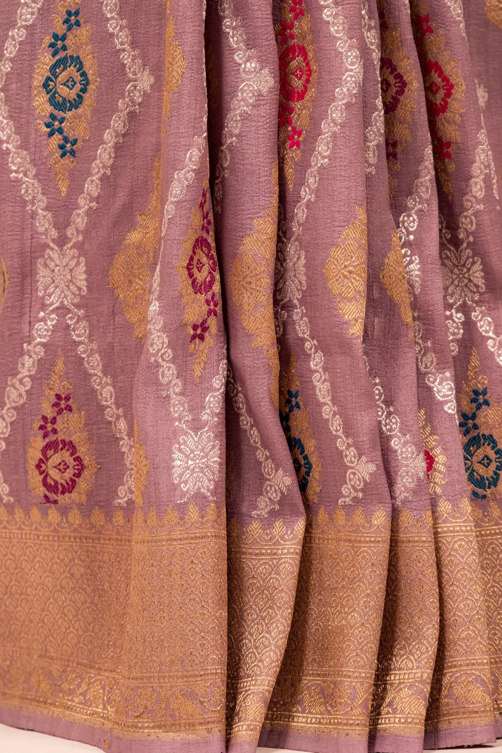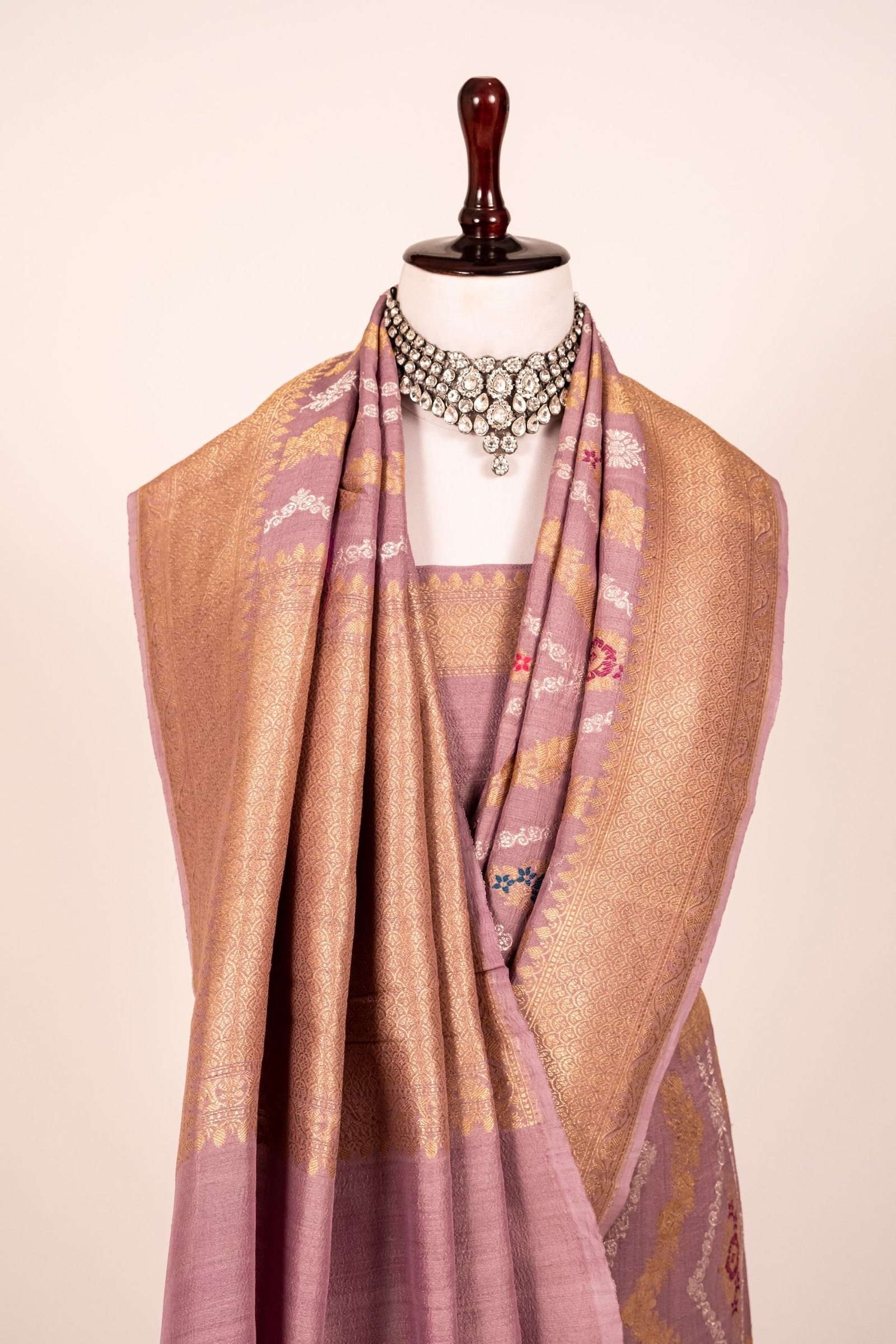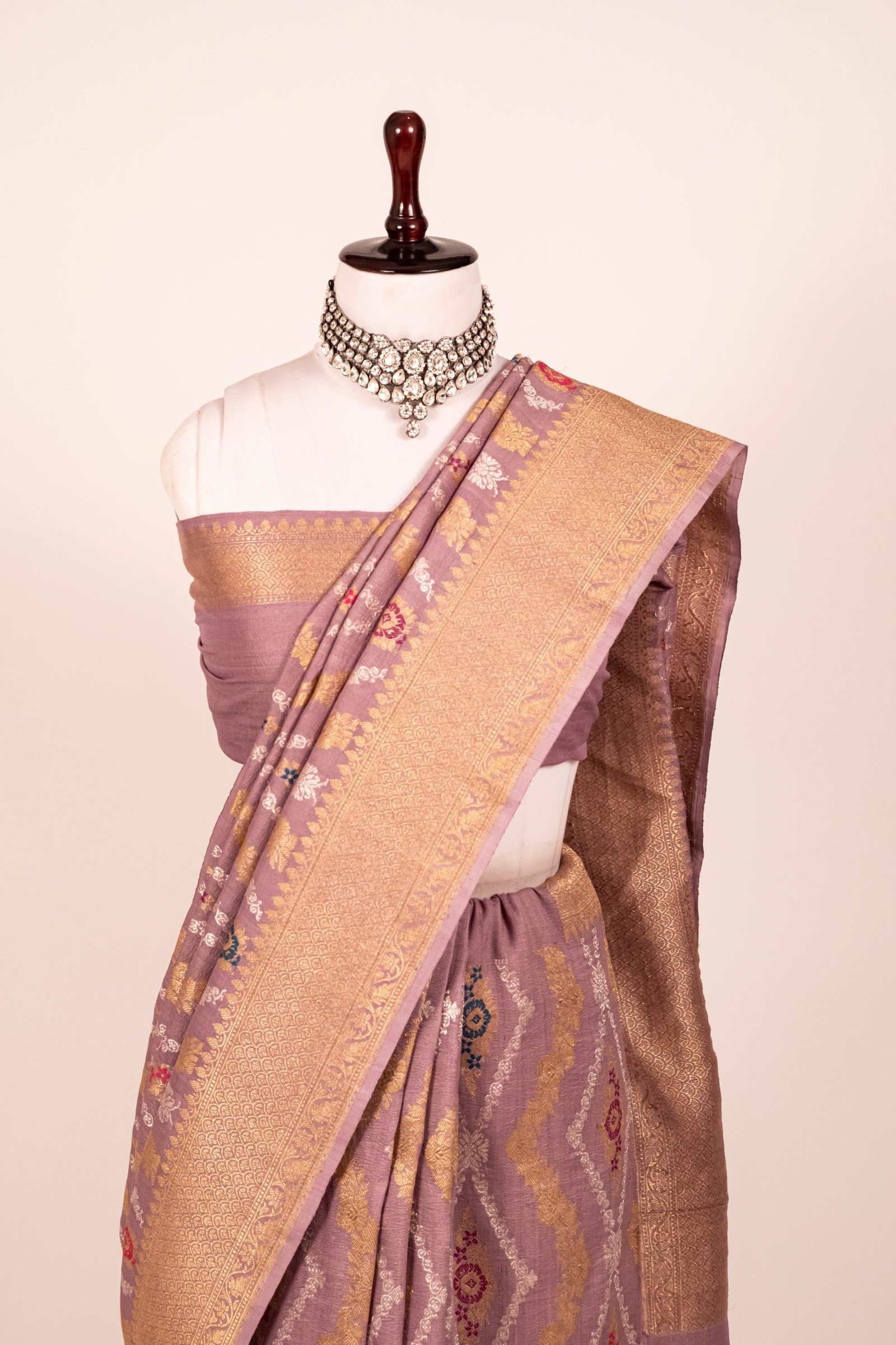 The serene Lavender hue adds a modern touch to this heritage piece, making it a perfect choice for weddings, festive celebrations, and grand events. Each thread reflects the mastery of Banarasi artisans and the legacy of handloom weaving.